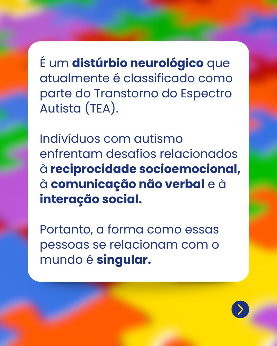 O autismo é um distúrbio neurológico do desenvolvimento que afeta principalmente a comunicação, o comportamento e a interação social. Mas vale lembrar: cada pessoa dentro do espectro é única — com suas particularidades, talentos e desafios.