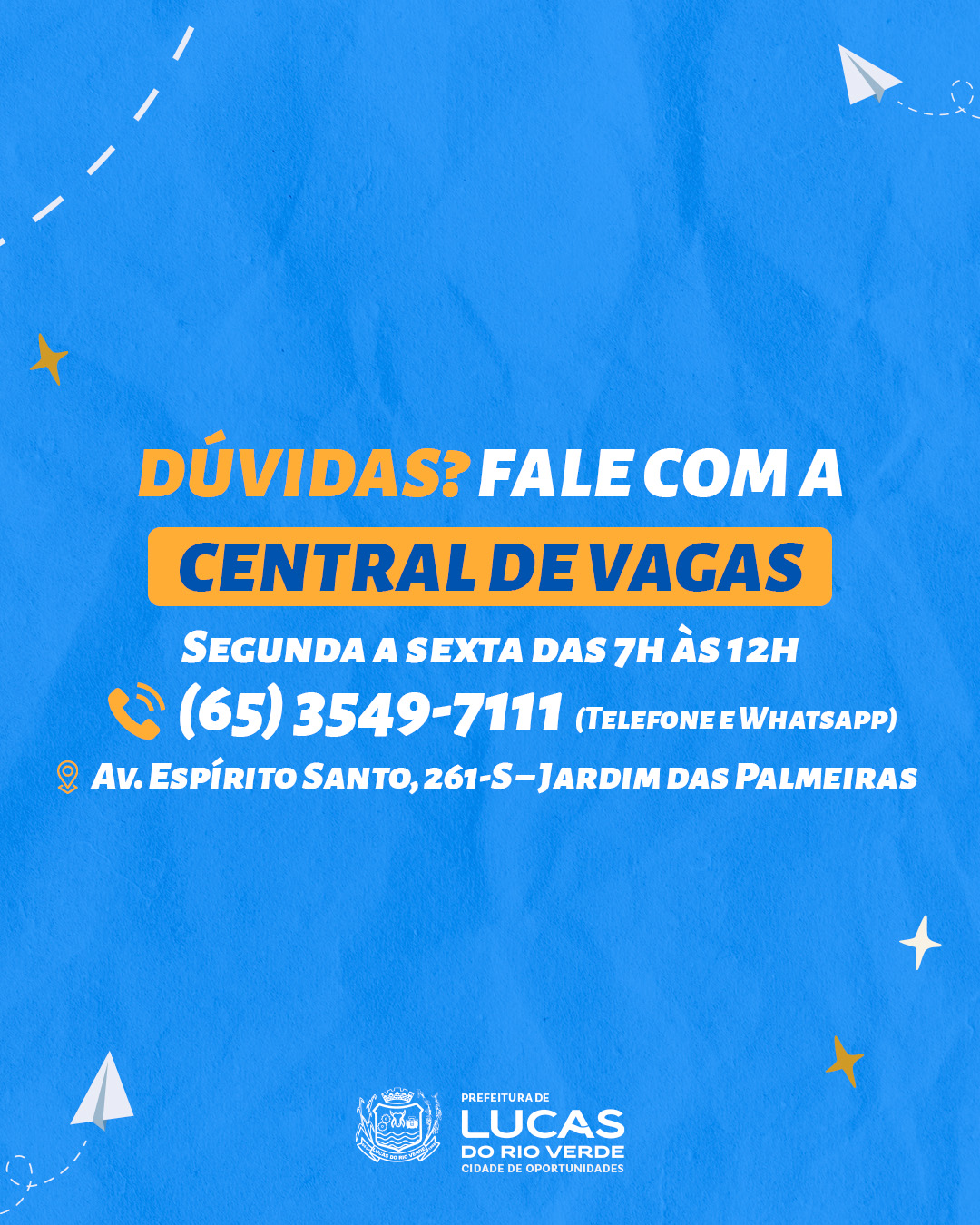 📍 Dúvidas? Procure a Central de Vagas: Av. Espírito Santo, 261-S, Jardim das Palmeiras. 📞 (65) 3549-7111 (Ligação e WhatsApp)