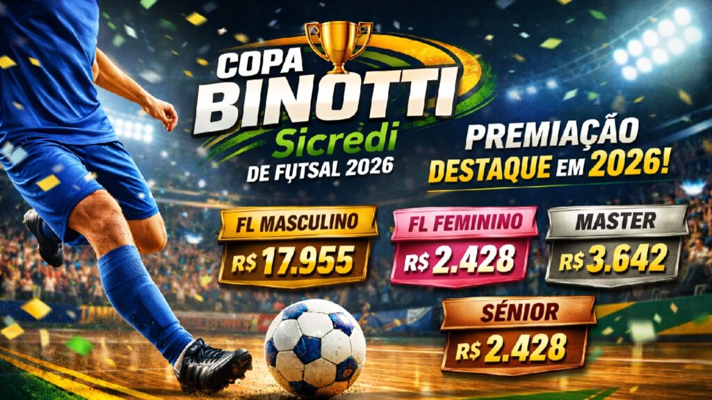 A bola ainda nem começou a rolar, mas a Copa Binotti/Sicredi de Futsal 2026 já é assunto entre atletas e torcedores. A organização divulgou oficialmente a premiação da competição, e os números chamam atenção, principalmente na categoria Força Livre Masculino, que terá uma das maiores bolsas já vistas no torneio.